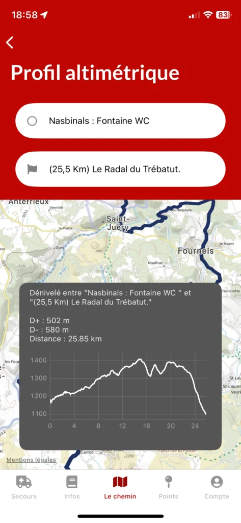 + En cliquant sur profil altimétrique et en déterminant 2 points vous optiendrez la D+ et la D-, la distance et la courbe de profil de la rando.